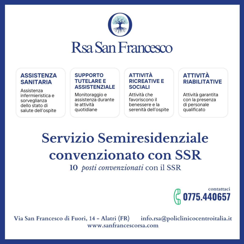 La R.S.A. San Francesco, gestita dalla Società RSA srl con sede in via San Francesco di Fuori, 14, Alatri (FR), è una struttura a ciclo residenziale, individuata nell’art.1, comma 1, lettera a), della L.R. n. 41/2003, che presta servizi socio-assistenziali finalizzati al mantenimento ed al recupero dei livelli di autonomia delle persone anziane e delle persone con disabilità psico-fisiche ed al sostegno della loro famiglia, sulla base di un piano personalizzato di intervento, come definito dall’art.1, comma 2, lettera c) della L.R. n. 41/2003.